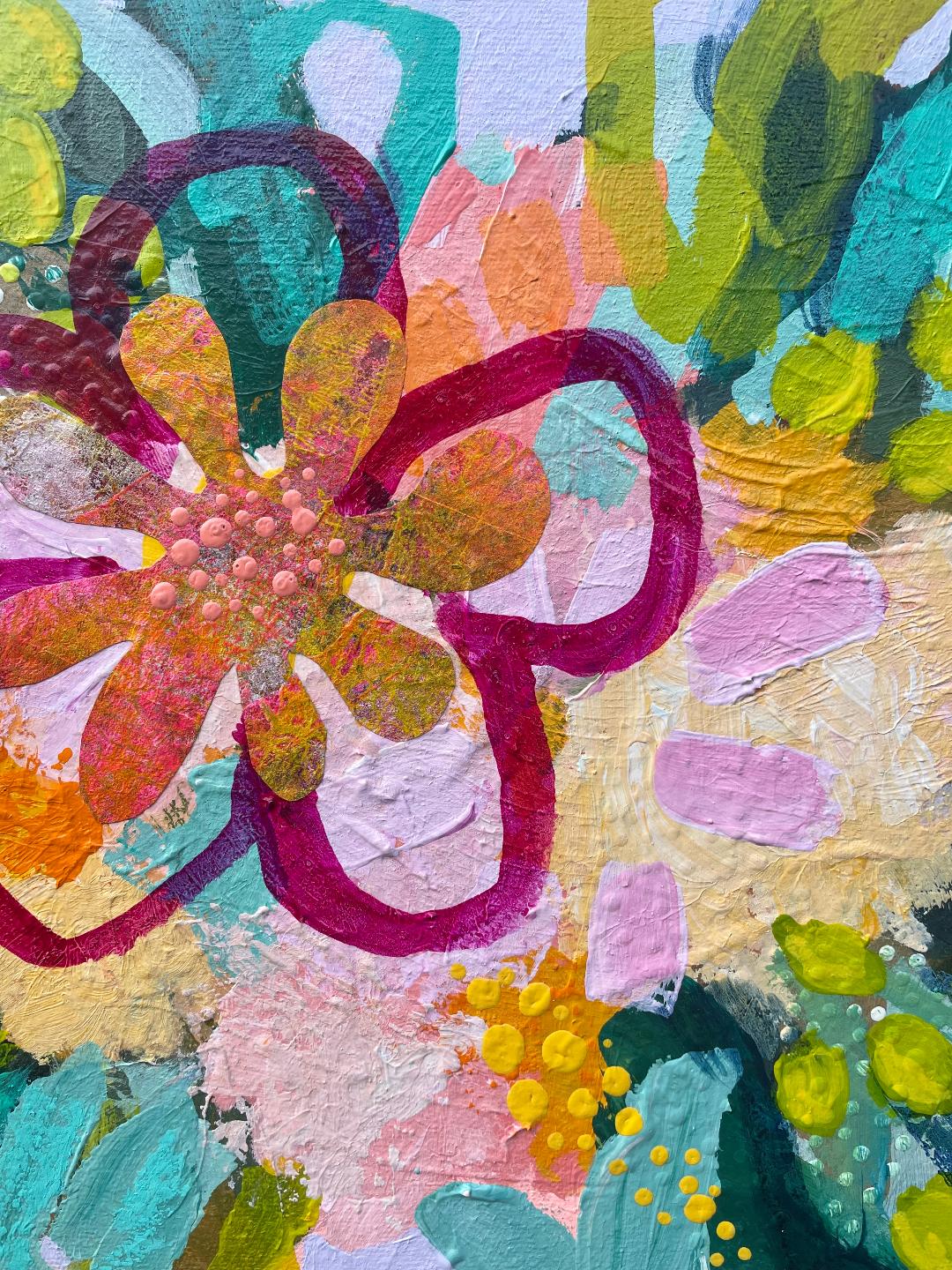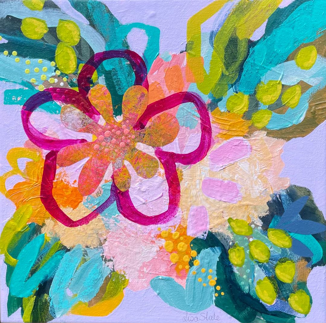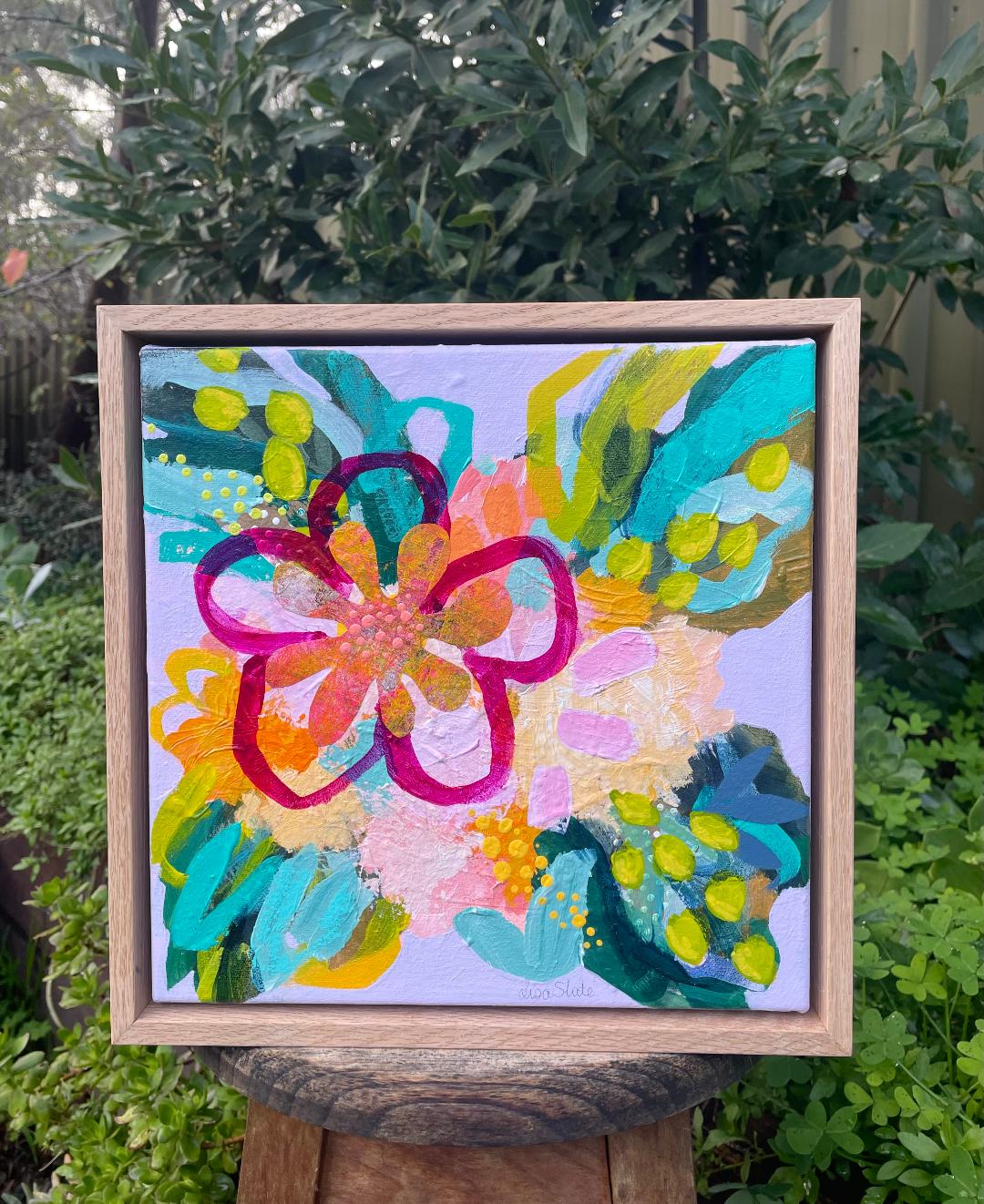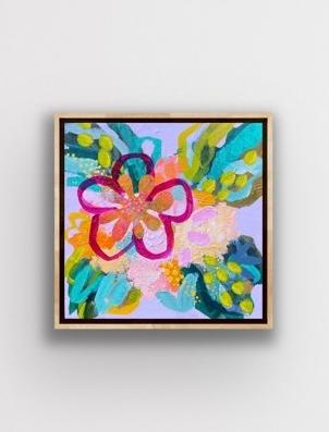 This 28cm x 28cm acrylic on canvas framed in oak is a delightful spray of colour with a whimsical portrayal of flowers in bloom. This can hang on your wall amidst a collection of work or due to the lovely wide frame stand on a dresser or bookshelf.
